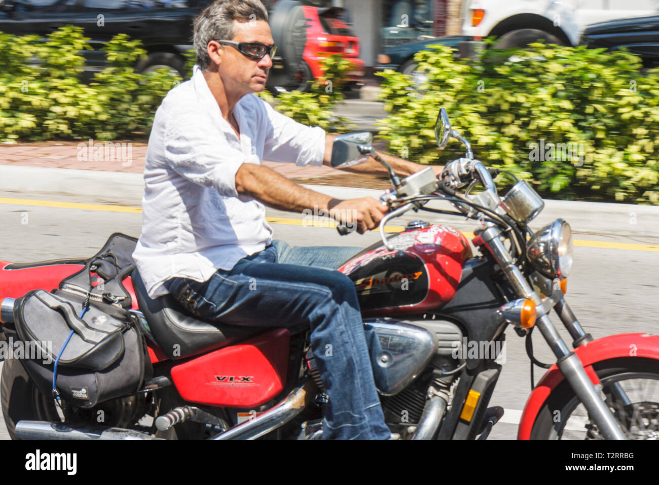 Florida Fl South Miami Beach Sobe Washington Avenue Adult Adults Man Men Male Honda Shadow Vlx Motorcycle Bike Riding No Helmet Moving Stock Photo Alamy