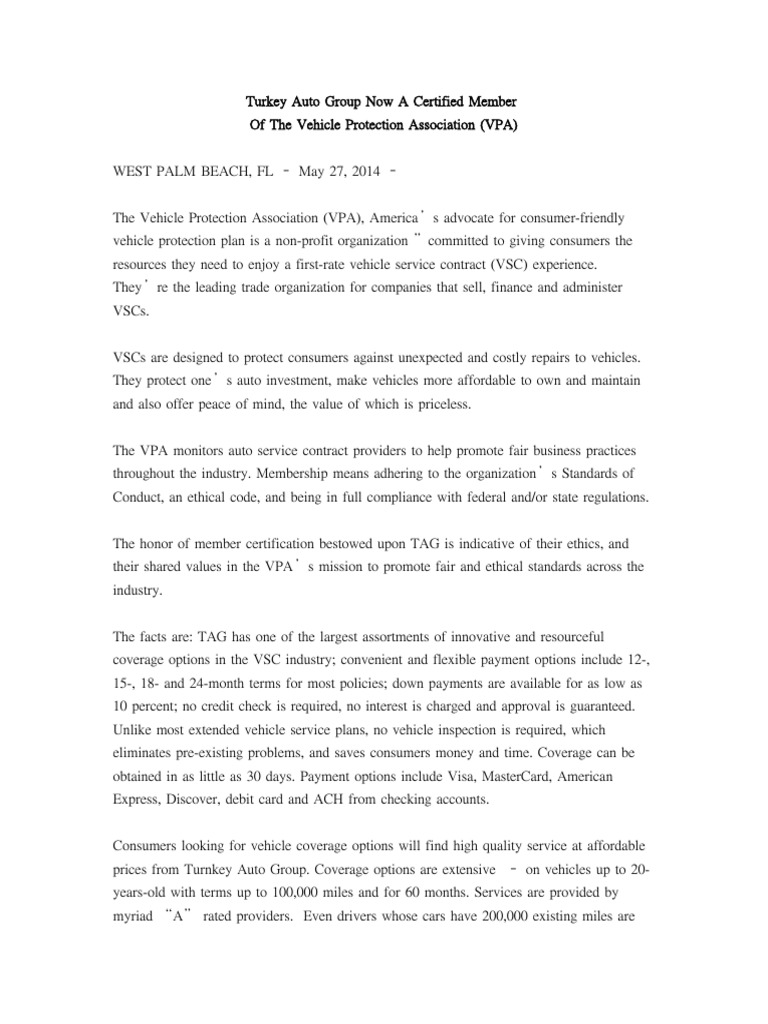Vehicle Protection Association Automotive Warranty Turnkey Auto Group Master Card Visa Inc